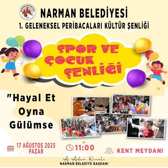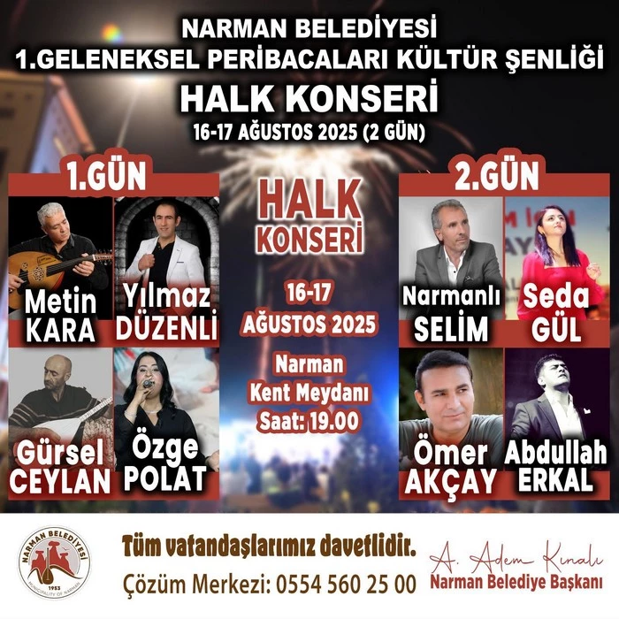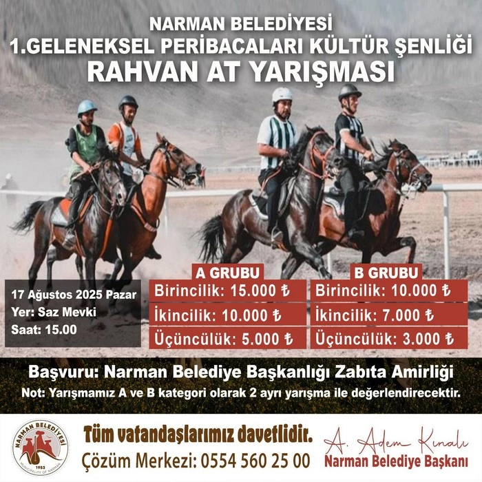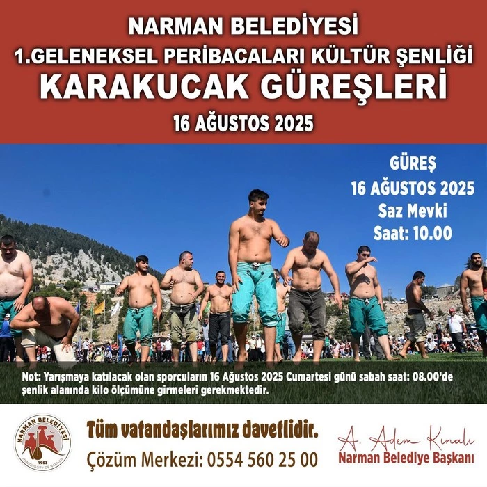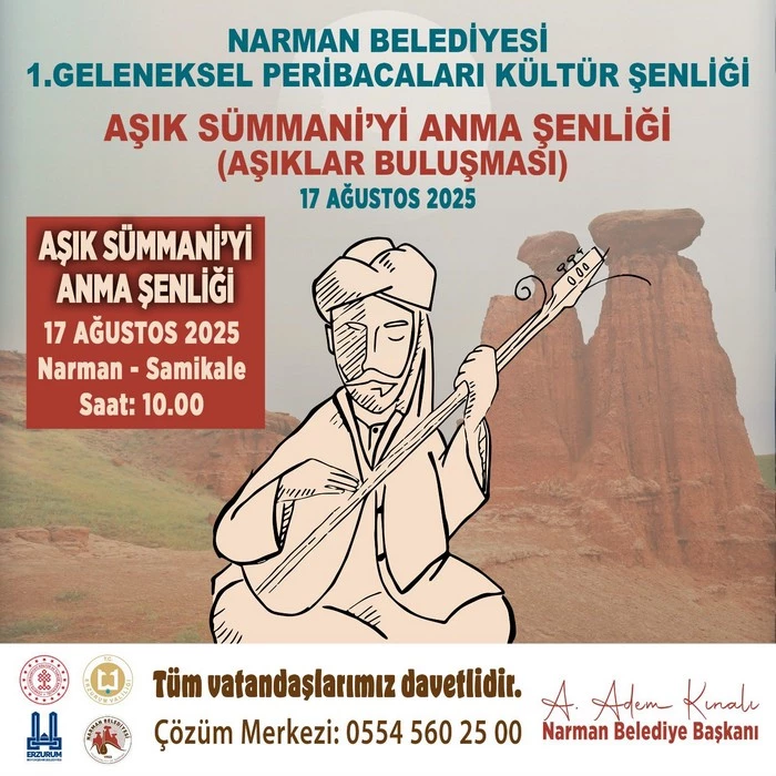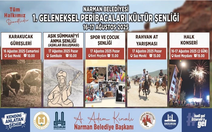 Narman Belediyesi olarak düzenlediğimiz 1. Geleneksel Peribacaları Kültür Şenliği’nde, siz değerli vatandaşlarımızı bir araya getirecek dopdolu etkinlikler hazırladık. Karakucak güreşlerinden halk konserine, aşıklar buluşmasından spor ve çocuk şenliğine kadar her anı dolu dolu yaşayacağımız bu güzel şenliğe tüm halkımızı davet ediyoruz.