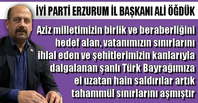 ''Azizi milletimizin birlik ve beraberliğini hedef alan, vatanımızın sınırlarını ihlal eden ve şehitlerimizin kanlarıyla dalgalanan şanlı Türk Bayrağımıza el uzatan hain saldırılar artık tahammül sınırlarını aşmıştır. Terör örgütlerinin pervasızlığı yalnız silahlarından değil, aylardır görmezden gelinen, meşrulaştırılan ve çözüm adı altında sunulan yanlış politikaların yarattığı cesaretten beslenmektedir. Bugün yaşananlar bir tesadüf değil, verilen ödünlerin ibretlik bir sonucudur. Şehit kanlarıyla sulanmış, şanlı Türk Bayrağımıza el uzatma cüretini gösteren teröristleri ve bu cüreti onlara kazandıran zihniyeti İYİ Parti Erzurum İl Teşkilatı olarak en sert şekilde kınıyor ve lanetliyoruz. Bu saldırılar, yıllar boyunca çözüm süreci adı altında terör örgütlerine verilen tavizlerin, görmezden gelinen ihanetlerin ve meşrulaştırılmaya çalışılan suçların acı bir sonucudur. Terörle müzakere eden, teröriste alan açan, devlete başkaldırıyı hoşgörüyle karşılayan her yaklaşım bugün yaşanan pervasızlığın zeminini hazırlamıştır. Sınırlarımız pazarlık konusu edilmeyecek namus çizgilerimizdir. Bayrağımız ise uğruna canlar verilmiş mukaddes bir değerdir.