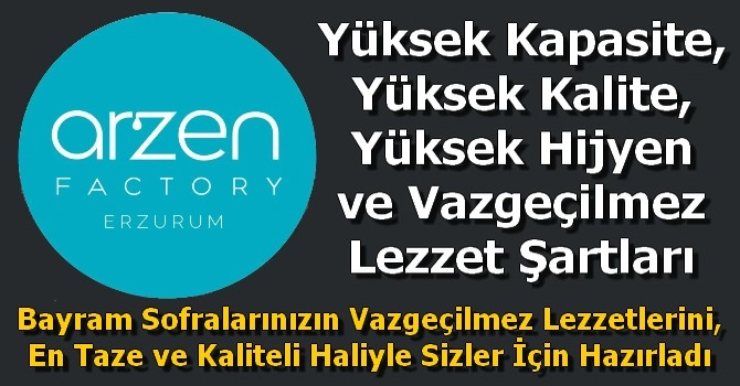 Yüksek kapasite, yüksek kalite, yüksek hijyen ve vazgeçilmez lezzet şartlarını göz önünde bulundurarak oluşturulan tesislerde hazırlanan bayram sofralarınızın vazgeçilmez lezzetlerini, en taze ve kaliteli haliyle sizler için hazırlayan Arzen, Misafirlerinize ikram edeceğiniz geleneksel tatlılardan, keyifli sohbetlerinize eşlik edecek atıştırmalıklara kadar aradığınız her şeyi sunuyor.