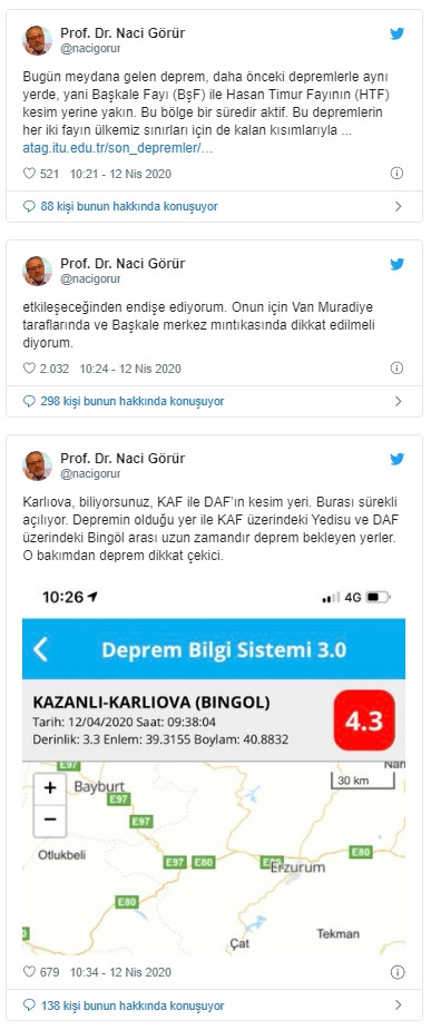 Kendisine ait sosyal medya hesabından bir dizi açıklamalarda bulunan Prof. Dr. Naci Görür, Van Muradiye taraflarında ve Başkale merkez mıntıkasını işaret etti.