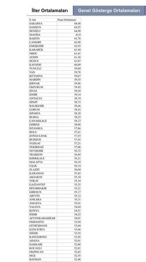 Buna göre 2025 yılında Erzurum 81 il arasında 18. sırada yer alırken Sakarya metropol İstanbul’u bile geride bırakarak ilk sırada yer aldı.