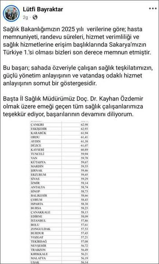 AK Parti Sakarya Milletvekili Lütfi Bayraktar’ın sosyal medya hesabından yaptığı paylaşıma göre Sakarya ili; hasta memnuniyeti, randevu süreleri, hizmet verimliliği ve sağlık hizmetlerine erişim başlıklarında 68,48 puan ile Türkiye 1’incisi oldu.
