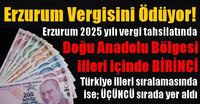 Erzurum vergi tahsilatının tahakkuka oranı düzeyinde Doğu Anadolu Bölgesinin ekonomisi gelişmiş Elazığ, Malatya ve Van illerini yine geride bırakırken, Türkiye İlleri sıralamasında da bir ilki gerçekleştirerek Kocaeli ve İstanbul’dan sonra 3’üncü sıraya yerleşti.