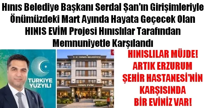 Hınıs Evim projesi kapsamında Erzurum Şehir Hastanesi ve Bölge Eğitim ve Araştırma Hastaanesi yakınlarında üç katlı bir binanın tutulduğunu ve Mart ayı içerisinde Hınıs Evim Projesini hayata geçireceklerini belirtti.